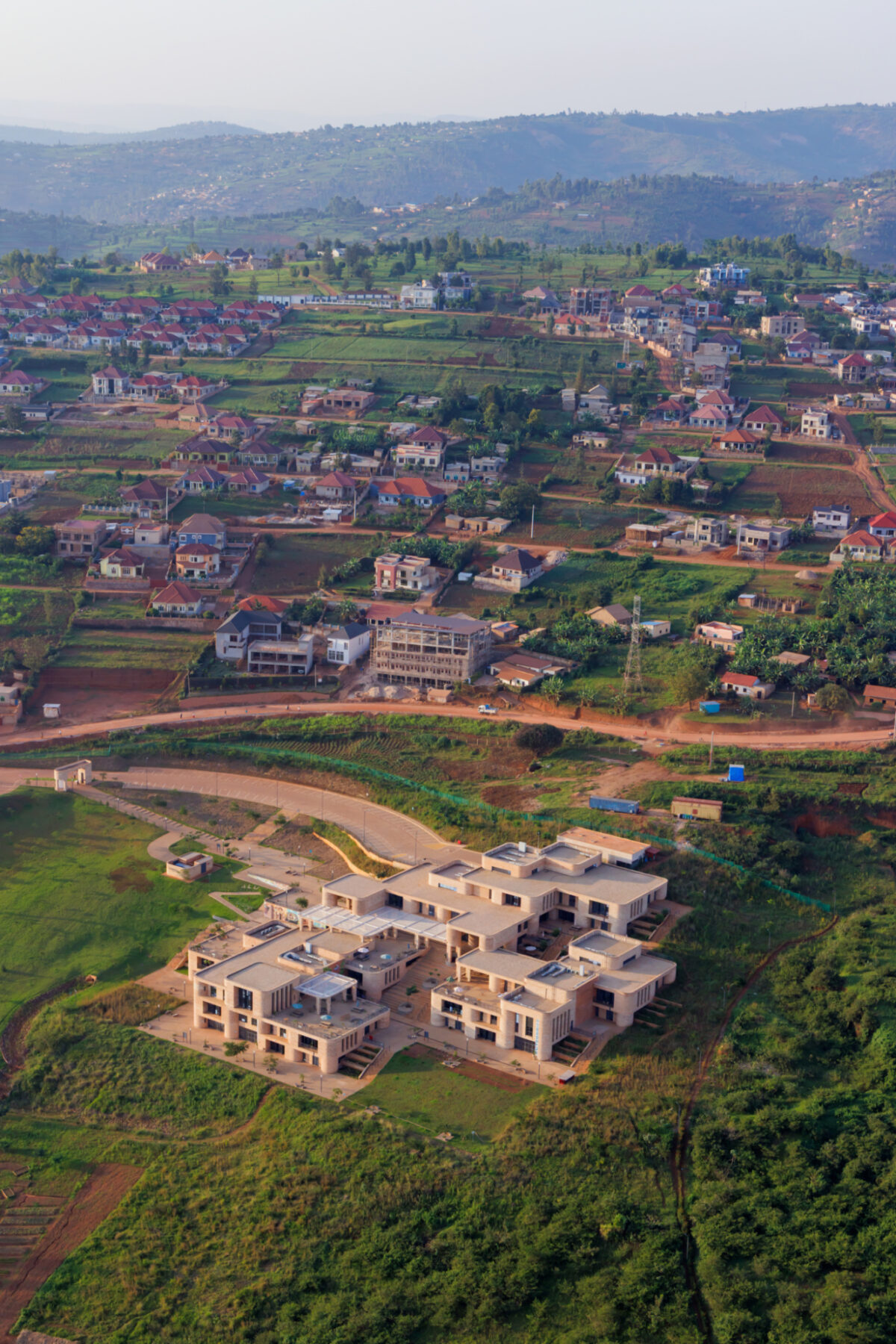 The modular brick system minimizes waste, simplifies construction, and strengthens local craftsmanship, rooting the project in the culture and resources of Rwanda. Set within the country's thousand hills, the buildings step with the land, opening to light, air, and views of the city.