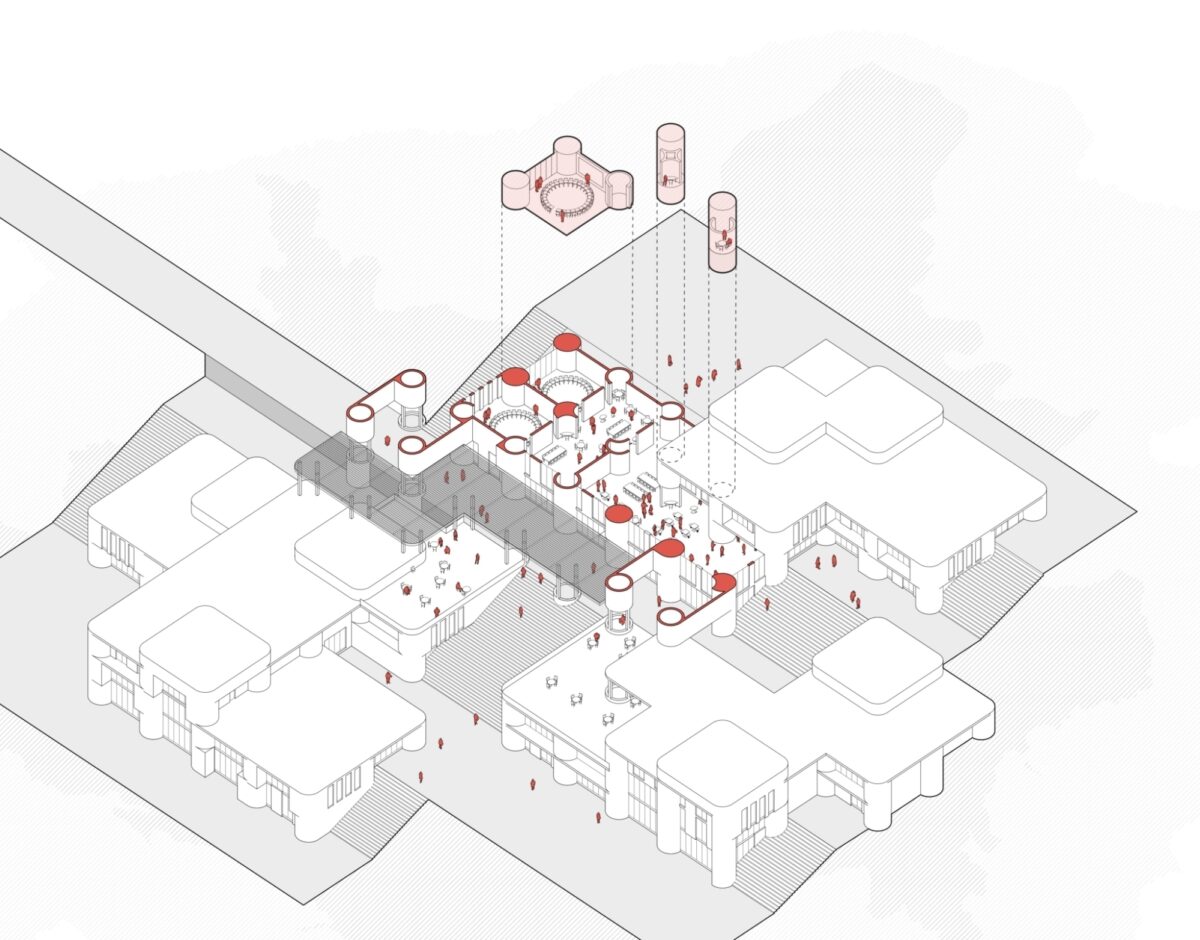 The design was inspired by mat-building theories of post war architecture like the Berlin Free University, where space is conceived not as a hierarchy but as an open and evolving field. Each pod acts as both structure and framework, allowing the campus to grow outward rather than upward, to adapt over time rather than impose order. This approach continues a lineage of schools that seek to dissolve institutional boundaries and turn education from a hierarchical system into a collective learning experience